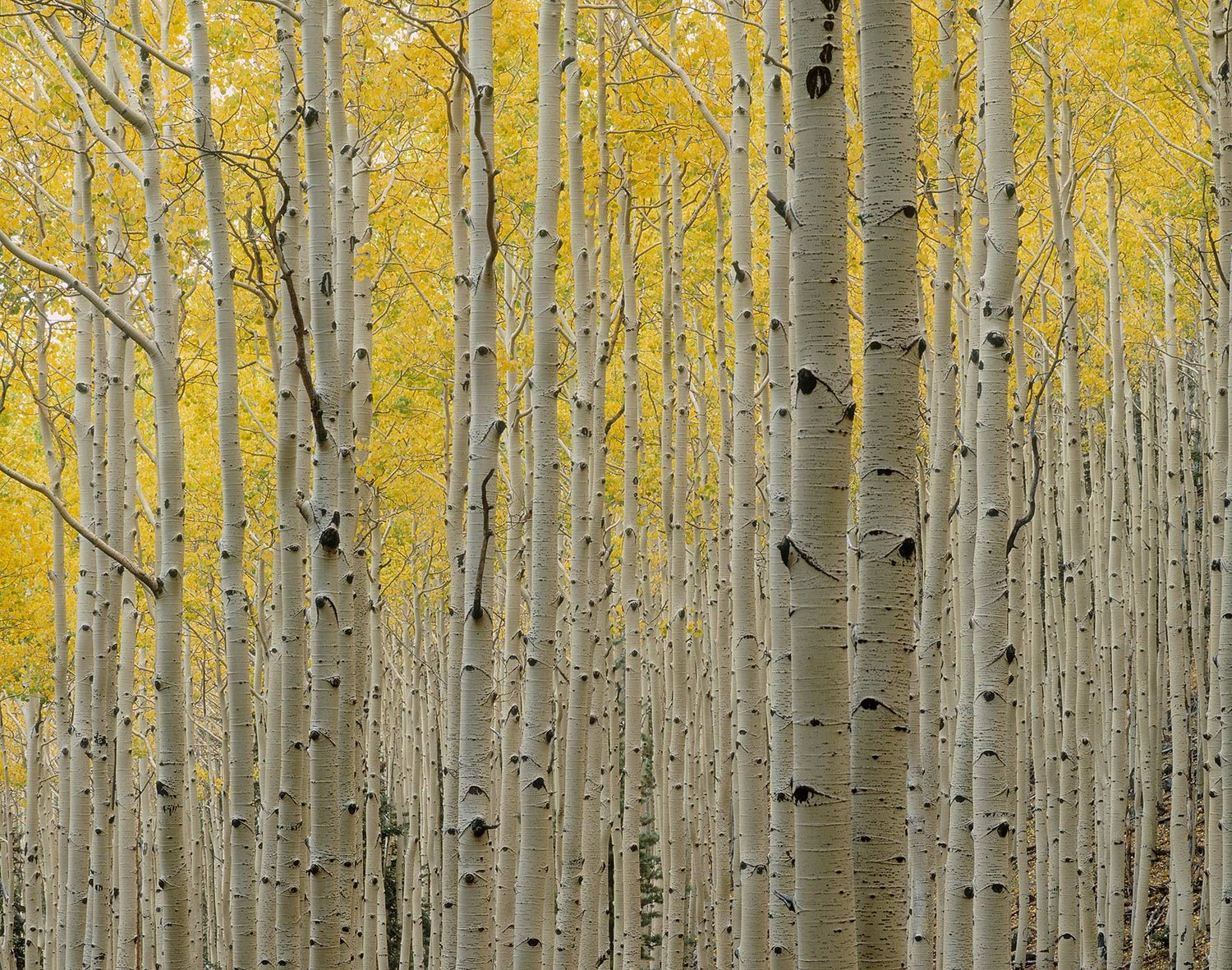 This image evokes the feeling of complete immersion in the wilderness, surrounded by trees as far as the eye can see. This immense stand of aspens, nestled in the cool inner basin of the volcanic San Francisco Peaks (Kachina Peaks to the Hopi) near my home in Flagstaff, is one of my favorite places to lose myself on a crisp autumn day. On this particular day I mounted the camera atop a rock and used a slightly long lens, flattening the perspective to emphasize the density of the aspens.