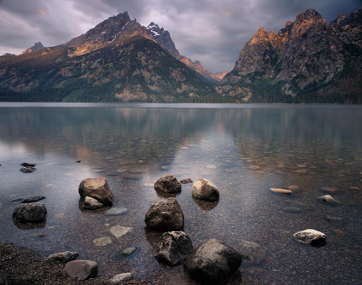 After many days of waiting for unique lighting, I returned to the shores of Jenny Lake for what looked like another overcast day. Suddenly, the sun sliced through the clouds for a moment, illuminating the Tetons and Cascade Canyon with a sliver of light. The long exposure time necessary to properly expose the large-format film blurs the moving clouds and allows the many small wavelets in the water to combine softly, emphasizing the stillness.