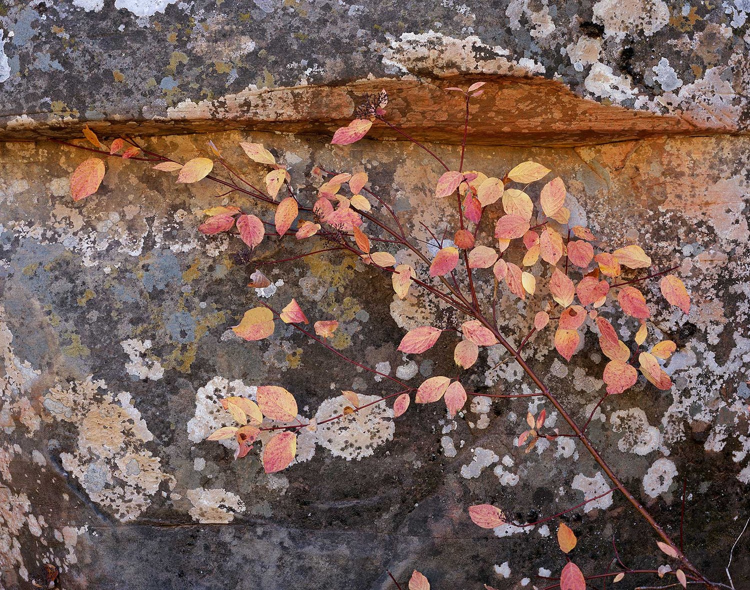 Sunlight reflected off the opposite wall of this narrow canyon lends a subtle orange glow to the lichen-covered sandstone, and to the leaves of a red-osier dogwood growing beside the intermittent steam in Pumphouse Wash, a side canyon of Oak Creek Canyon, in the Coconino National Forest between Flagstaff and Sedona.