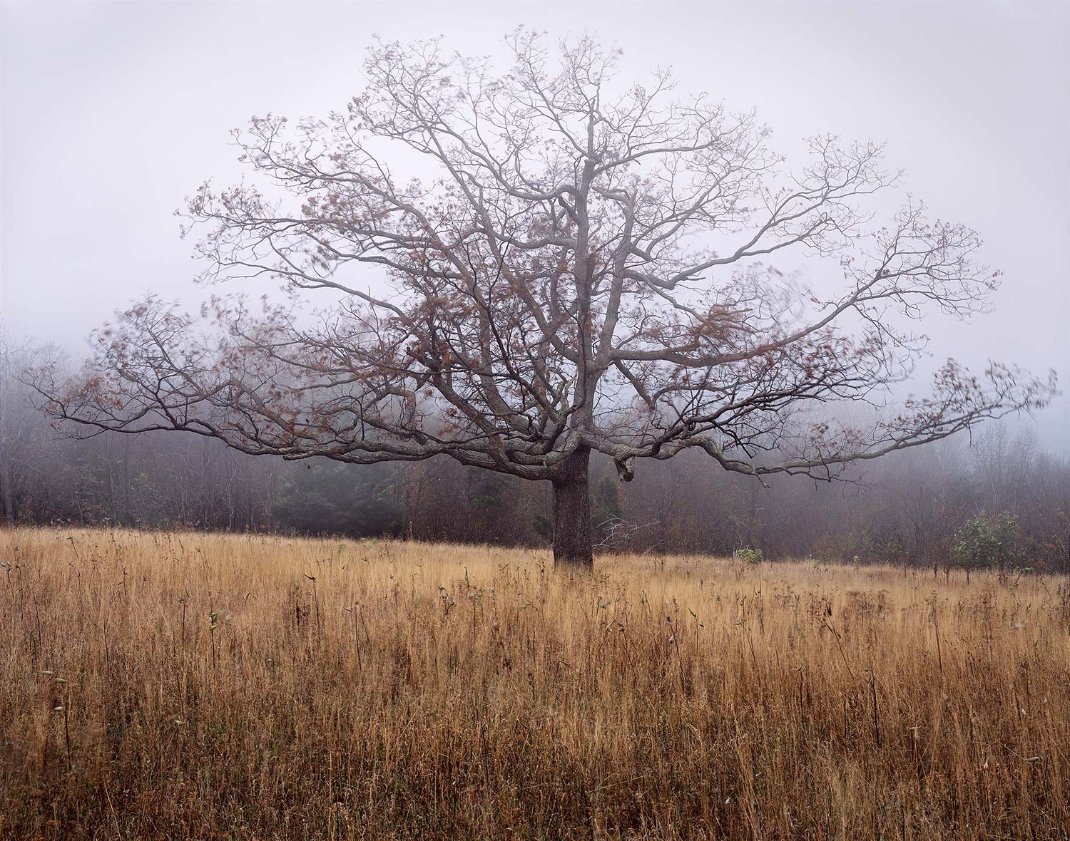 The sprawling limbs of a venerable old white oak tree sway in the mountain top breeze as thick fog obscures the distant Shenandoah Valley. The simplicity of the single solid oak, the subtle tones of late fall, and the mystery of fog compelled me to make this photograph. I held the shutter open extra long to catch the blowing wind.