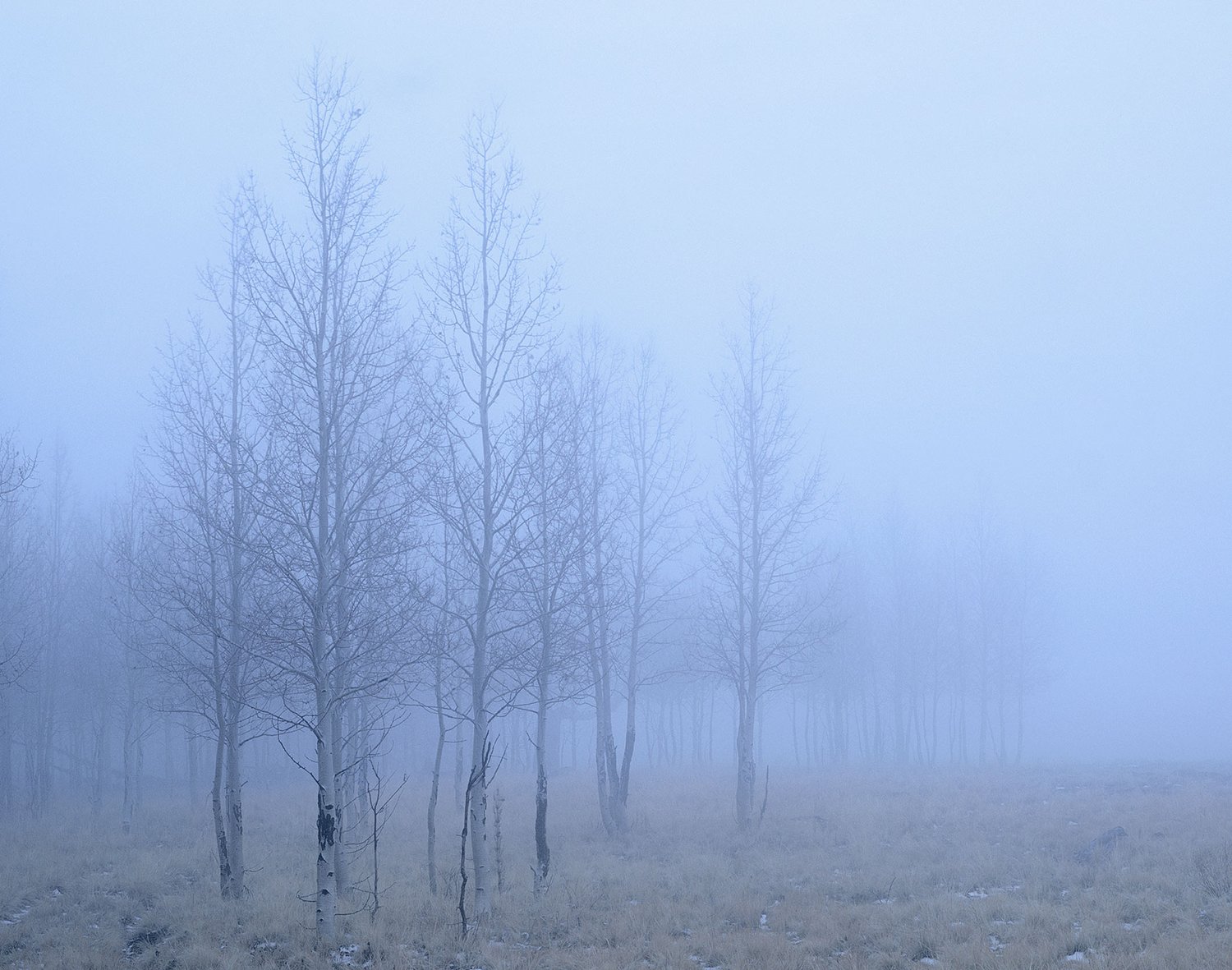 A cloud obscures the top of the San Francisco Peaks in the Coconino National Forest near Flagstaff, resulting in an icy fog on the high slopes. The soft, paintery tones convey the pristine stillness of winter and barely suggest the aspen trees, leaving the rest to the imagination.